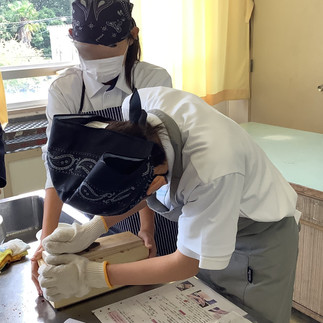 家庭でかつおぶしのだしをとったことのある生徒は、学年の3割もおらず、また、[顆粒だしの方がおいしい]、「ほんもののだしよりもカップめんなどの味の方が好き」、という生徒もかなりいる中、本物のかつおぶし・だしの味を体験し、その良さを感じてほしい、という願いから、今回のかつおぶしけずり体験に取り組みました。