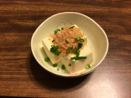 最後に、ごはん・冷ややっこ・ほうれんそうのおひたしに、けずったかつおぶしをかけ、しょうゆをたらして、試食しました。